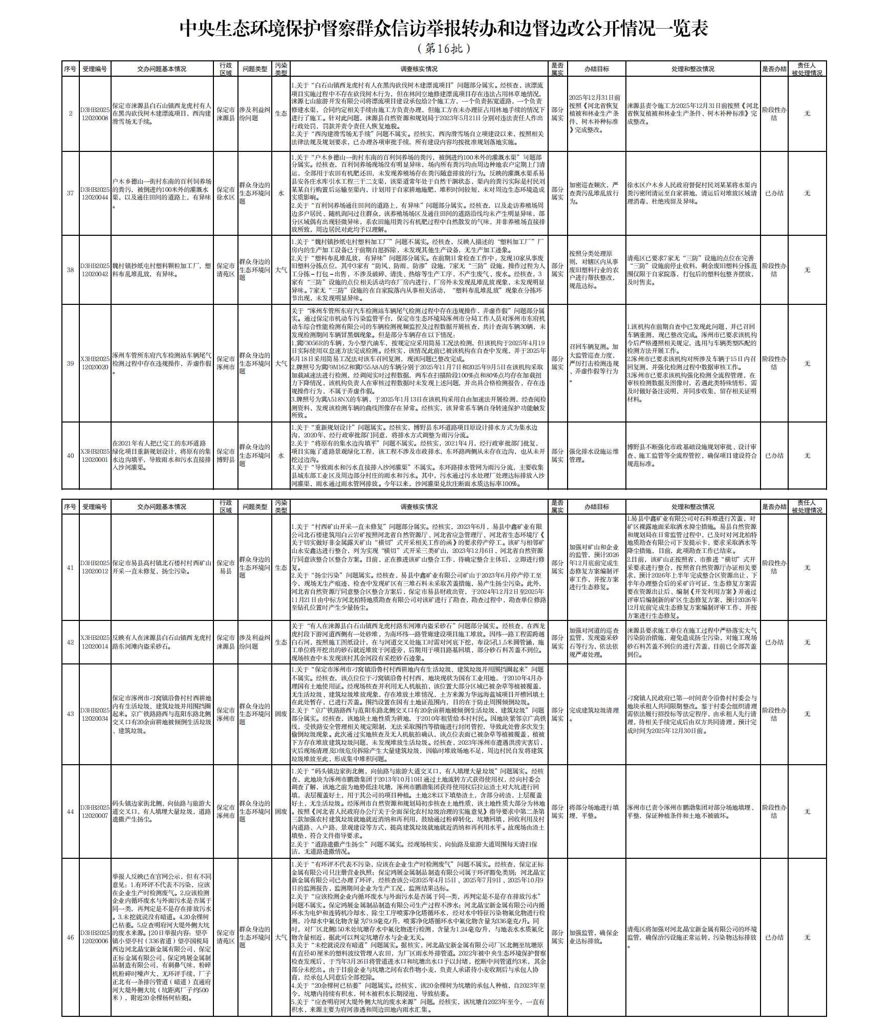| 中央生态环境保护督察组交办保定市第十六批群众信访举报案件办理情况 |