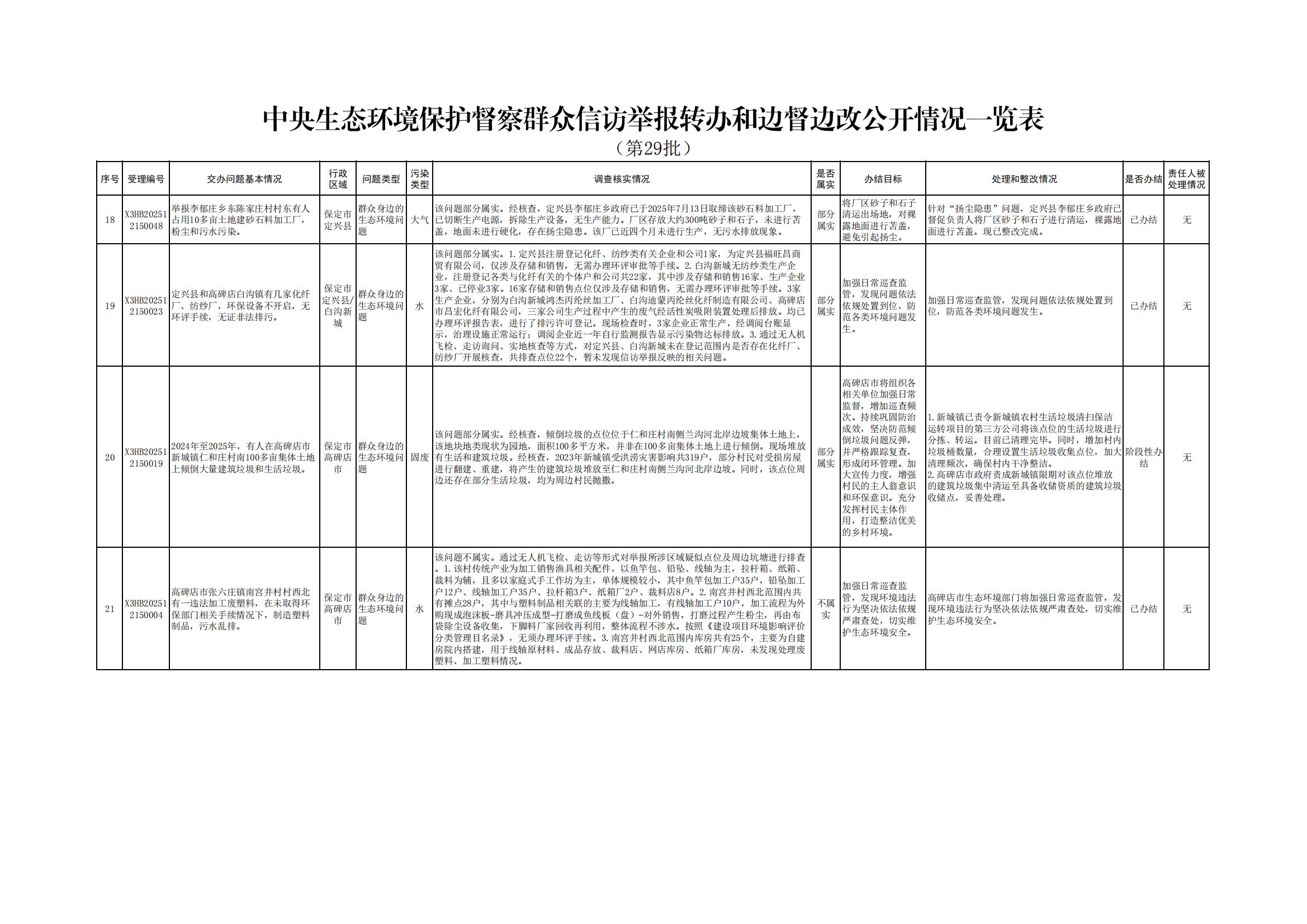 | 中央生态环境保护督察组交办保定市第二十九批群众信访举报案件办理情况 |