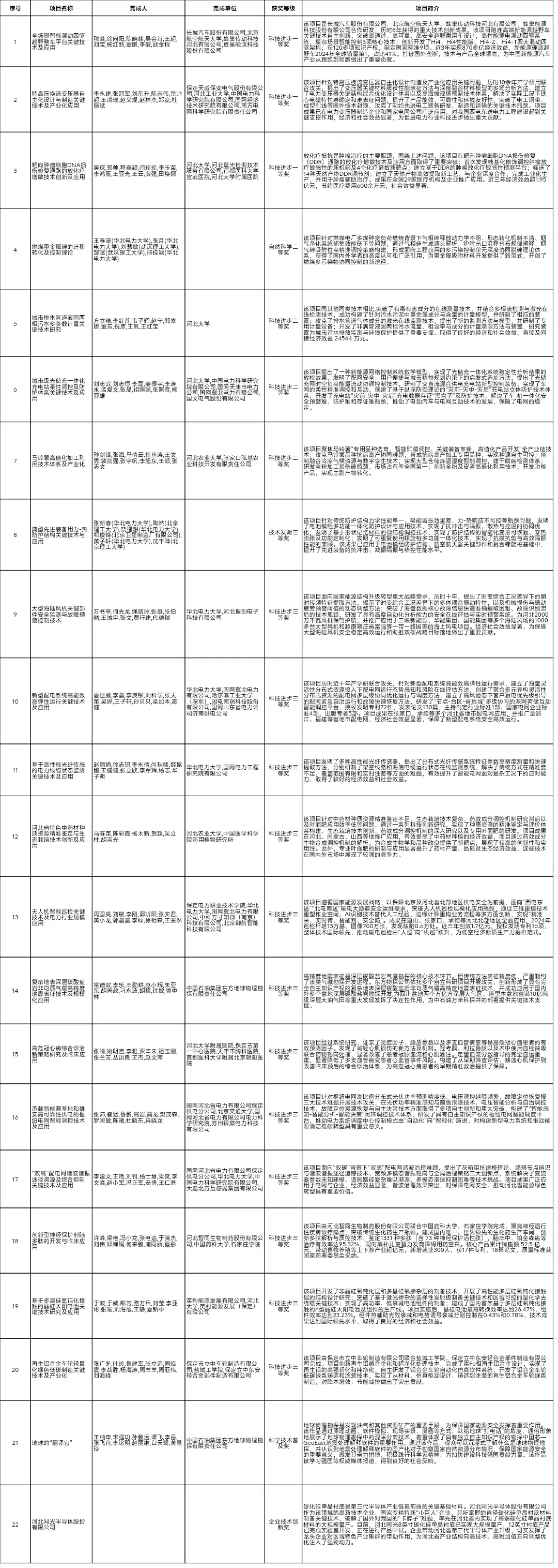4月22日,2025年度河北省科学技术奖励大会在石家庄召开,对促进我省科学技术进步和经济社会发展作出突出贡献的单位和个人颁奖,275项(人)获2025年度河北省科学技术奖。其中,保定有33项(人)获2025年度河北省科学技术奖。 据悉,2025年度河北省科学技术突出贡献奖1人,授予河北地质大学终身特聘教授季强;省自然科学奖21项,其中一等奖4项、二等奖10项、三等奖7项;省技术发明奖17项,其中一等奖5项、二等奖7项、三等奖5项;省科学技术进步奖218项,其中,一等奖28项、二等奖80项、三等奖98项、企业技术创新奖5项、科学技术普及奖3项、职工技术创新奖4项;18人获省科学技术合作奖。 保定市域获得省科学技术奖共计33项。其中:保定市提名22项(清单附后),包括科学技术进步一等奖3项、二等奖3项、三等奖12项、普及奖1项、企业技术创新奖1项,自然科学二等奖1项,技术发明三等奖1项;省直部门提名11项,包括自然科学一等奖1项、三等奖1项,技术发明二等奖1项,科技进步二等奖2项、三等奖6项。 2025年河北省科学技术奖获奖项目清单 保定市提名
