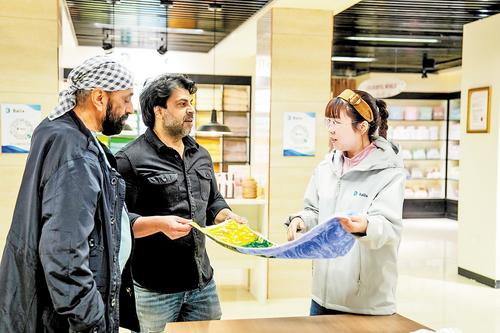 3月31日,高阳纺织企业销售人员与印度客商进行洽谈。