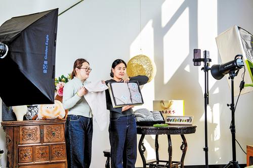 3月31日,高阳县棉花图纺织博物馆,工作人员直播销售毛巾套装。