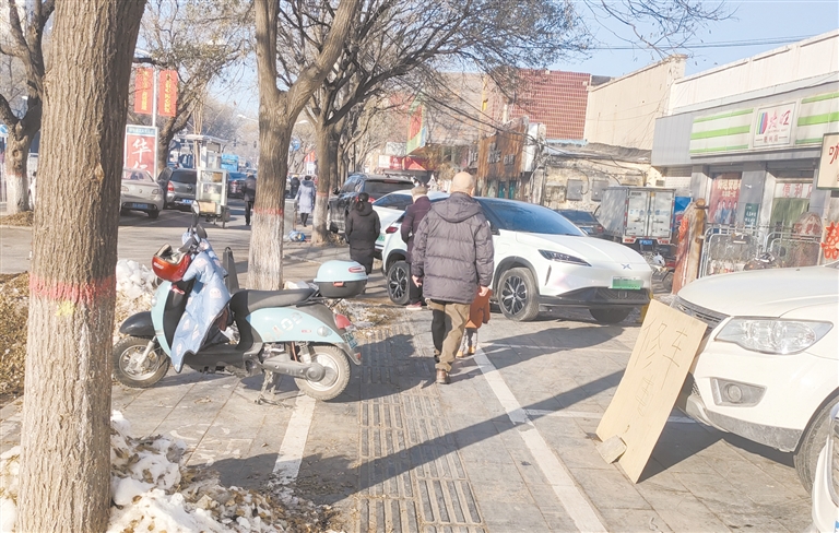 在红星路市民宿舍小区门口两侧的人行道上,经常有车辆占道停车,影响行人出行。