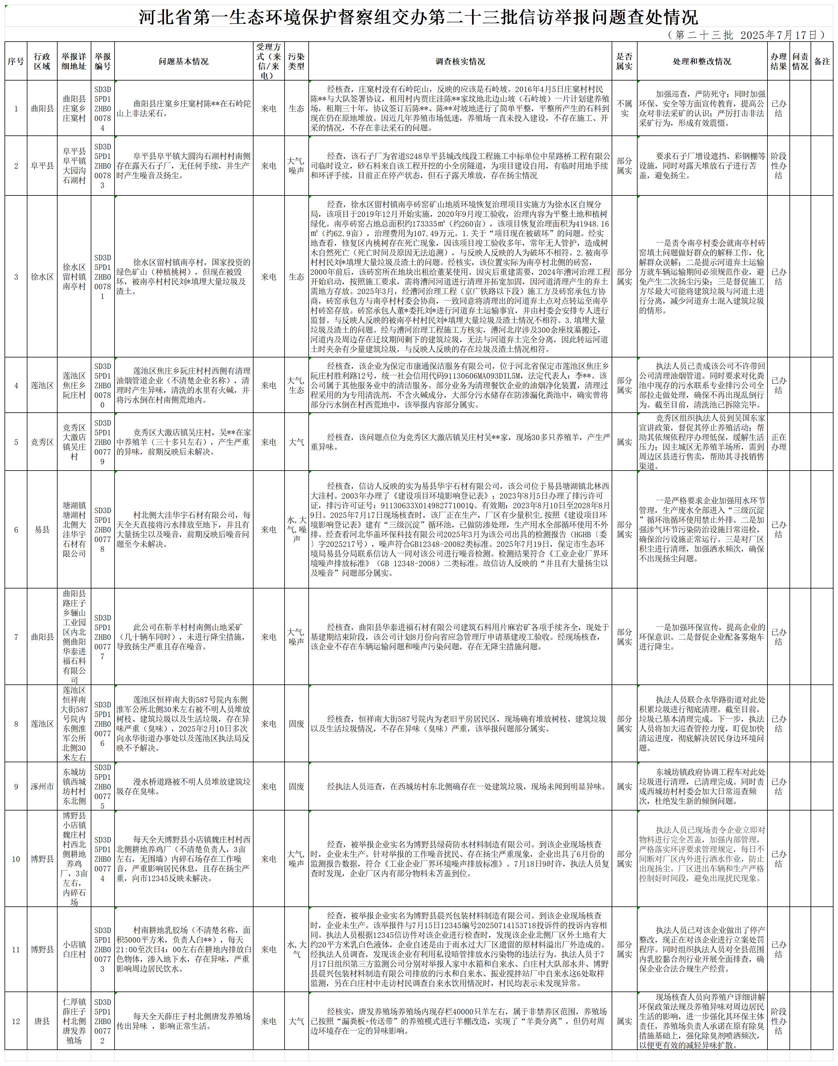 河北省第一生态环境保护督察组交办第二十三批信访举报问题查处情况