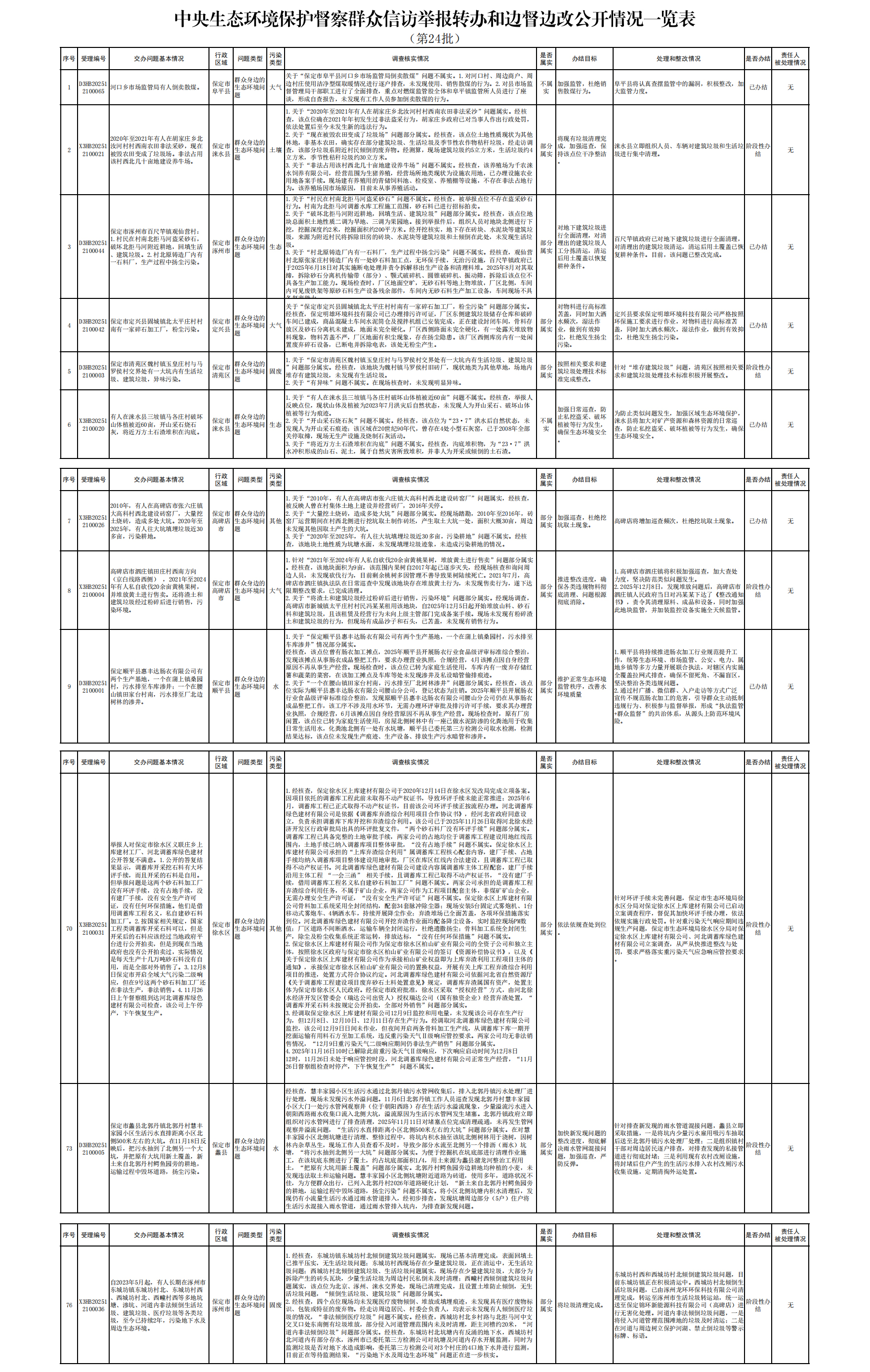 | 中央生态环境保护督察组交办保定市第二十四批群众信访举报案件办理情况 |
