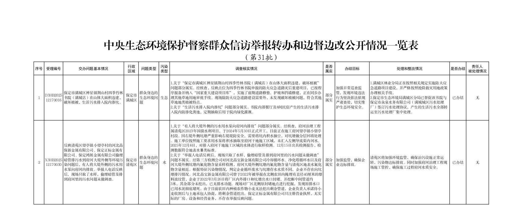 | 中央生态环境保护督察组交办保定市第三十一批群众信访举报案件办理情况 |