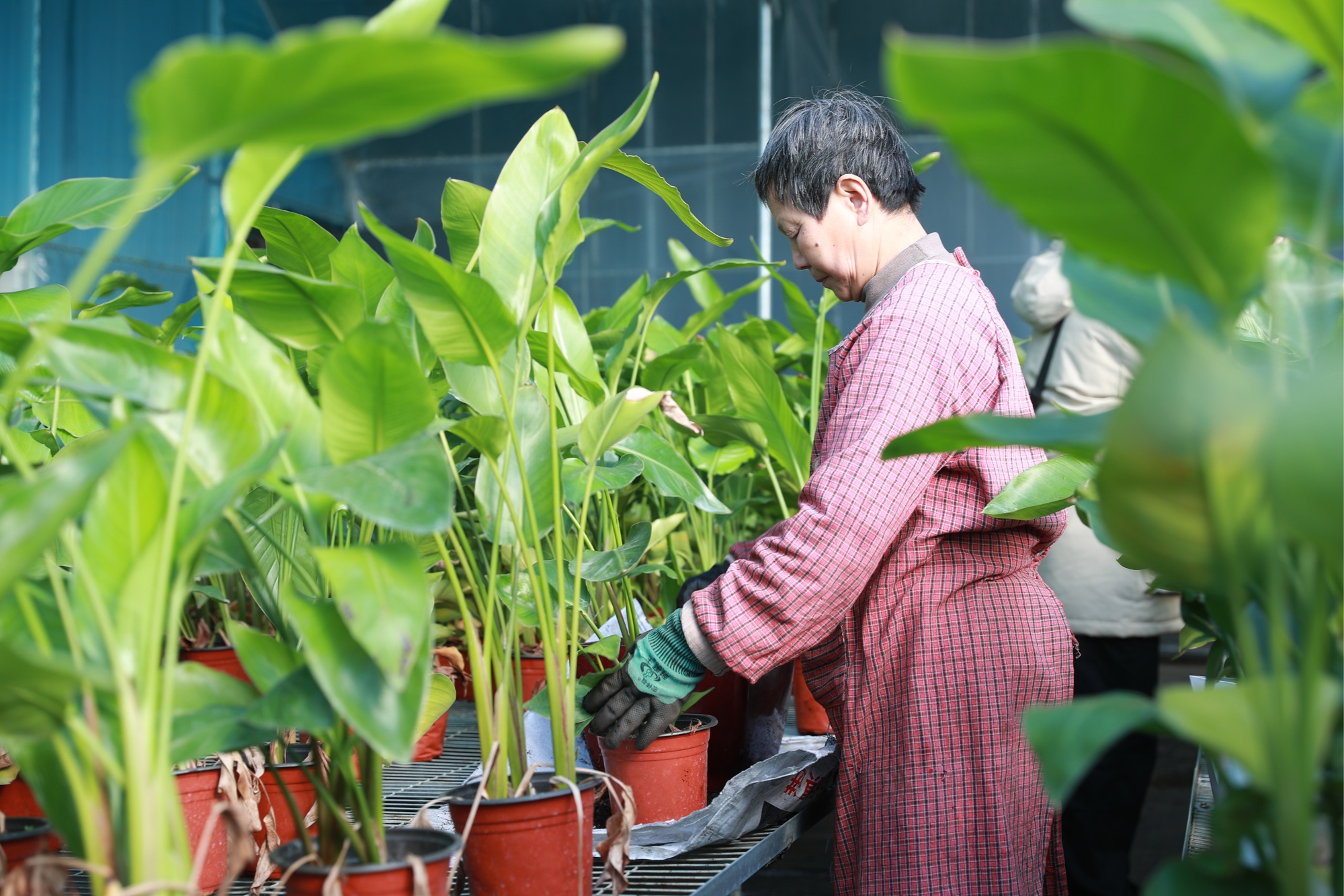 近日,年宵花销售进入旺季。1月13日,河北省顺平县高于铺镇北城村的春源花卉种植基地内,6座现代化智能温室大棚里的天堂鸟长势喜人,工人们正忙着塑形、培土、施肥等管护工作。