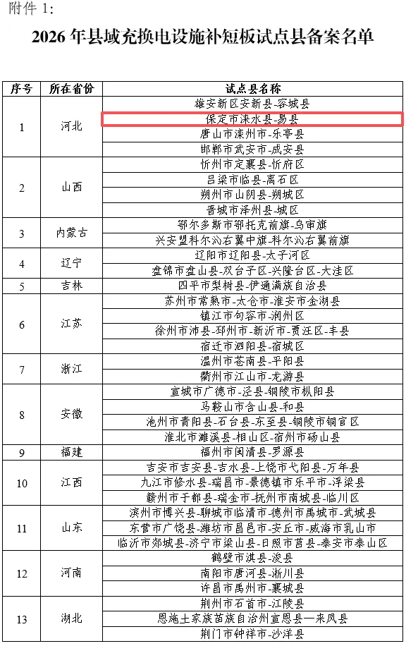 | 国家级试点!涞水、易县入选 2026 年县域充换电设施补短板试点 |
